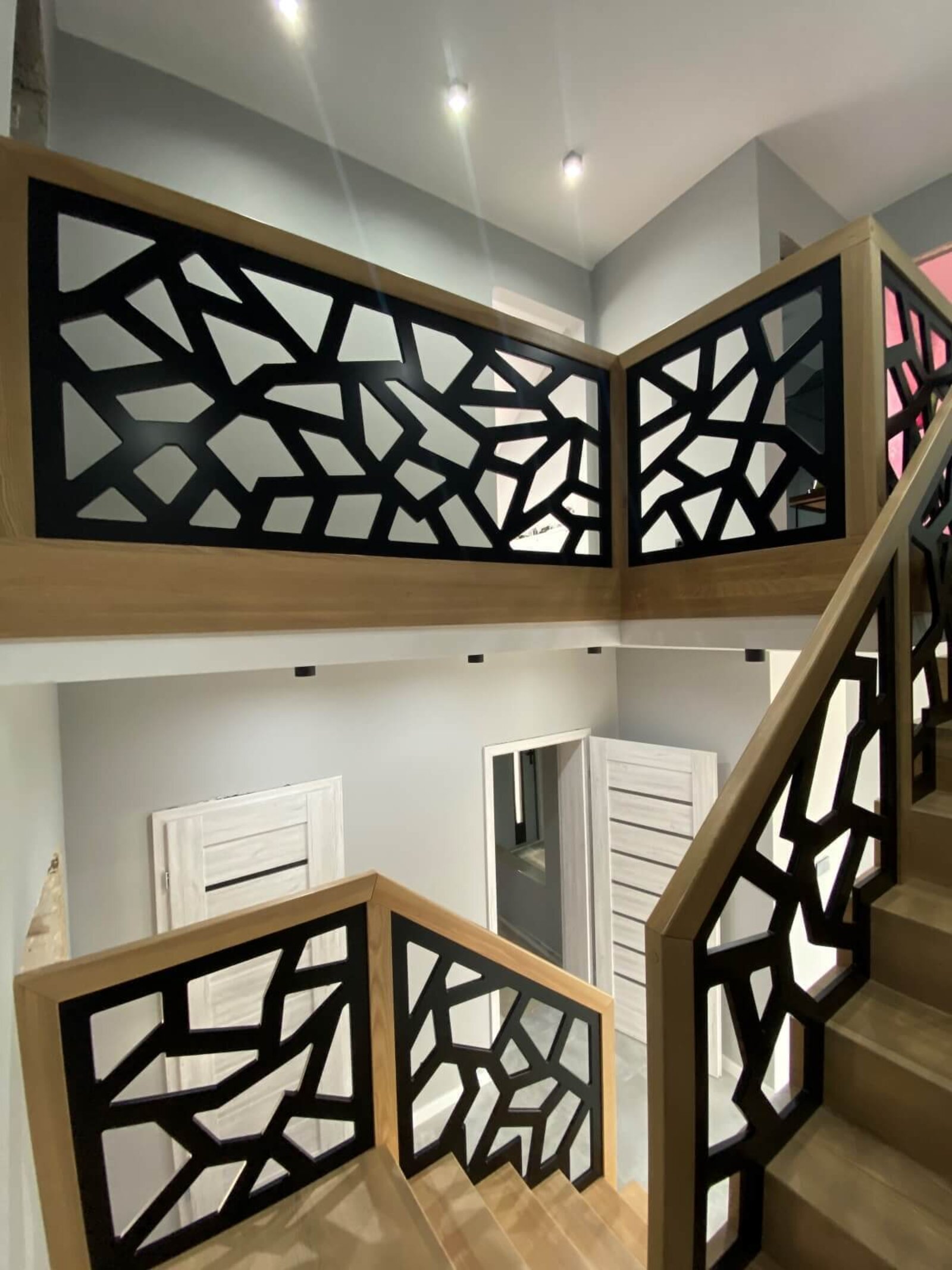 Konstrukcja: Schody dywanowe na beton Balustrada: MDF frezowany, malowany na czarno Drewno: Jesion Kolor: Sonoma