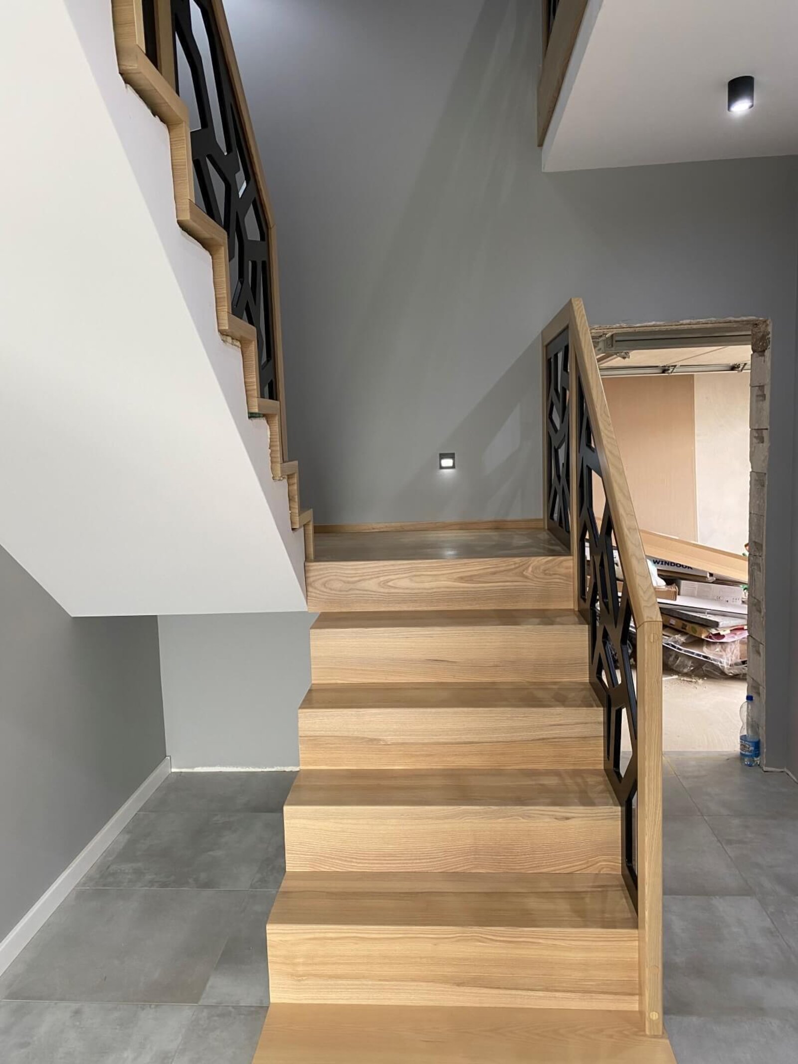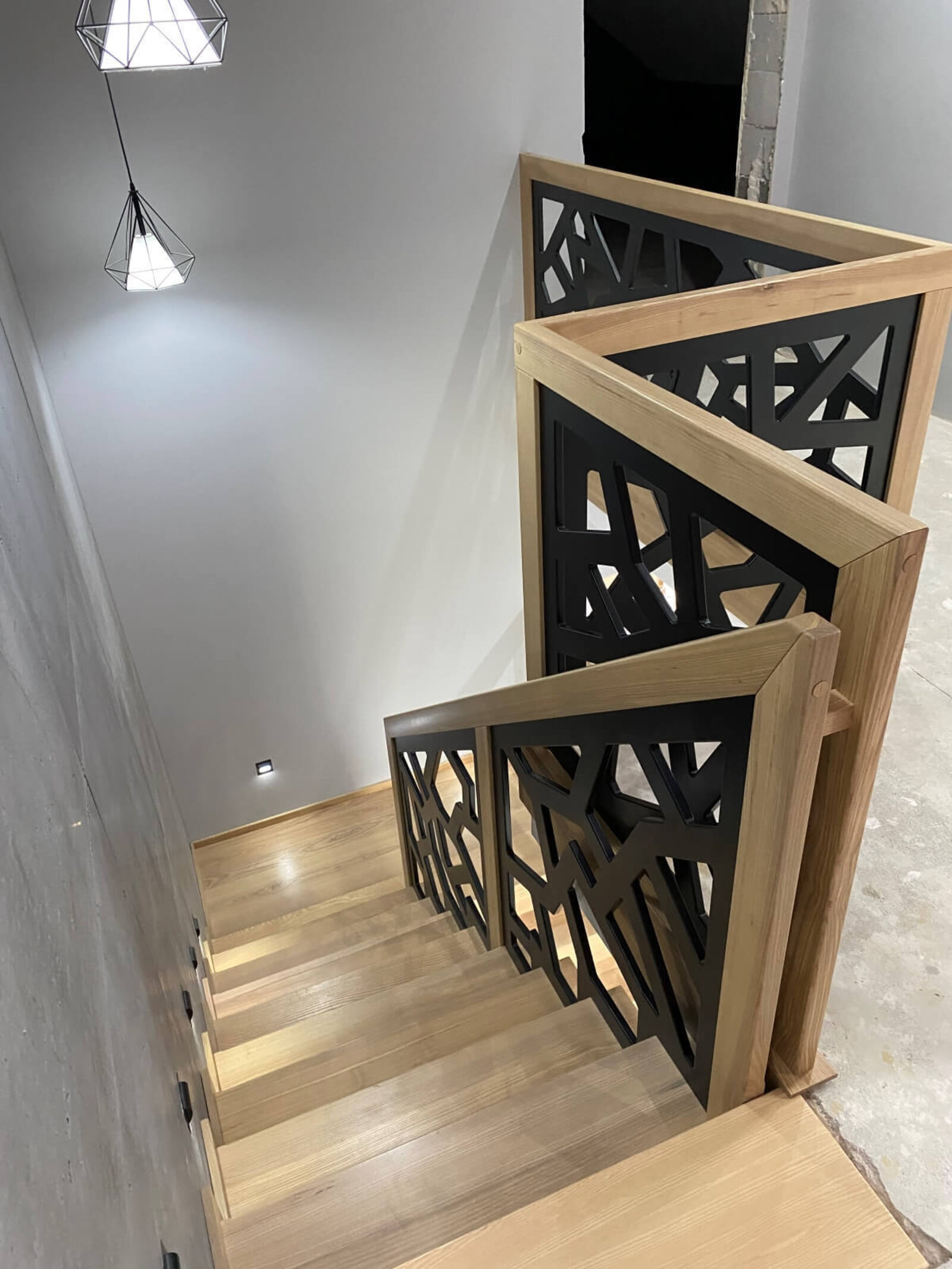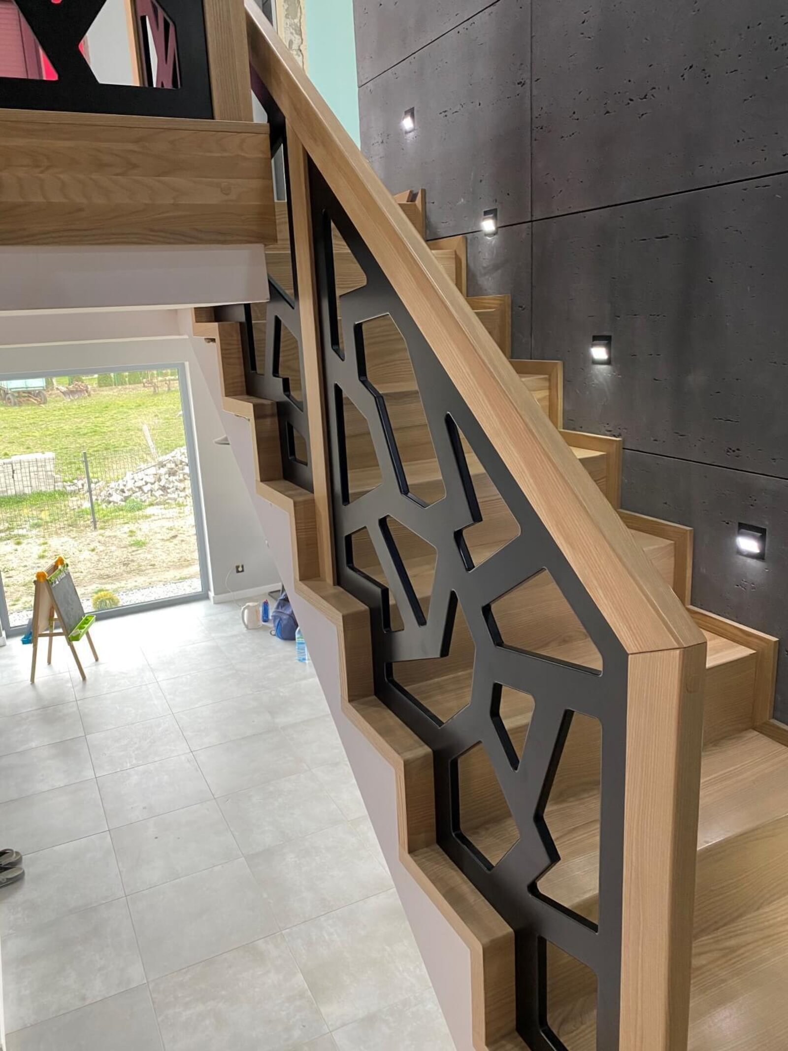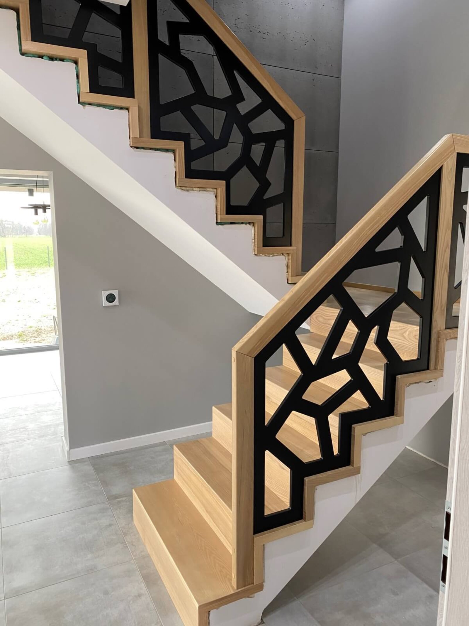 Konstrukcja: Schody dywanowe na beton Balustrada: MDF frezowany, malowany na czarno Drewno: Jesion Kolor: Sonoma