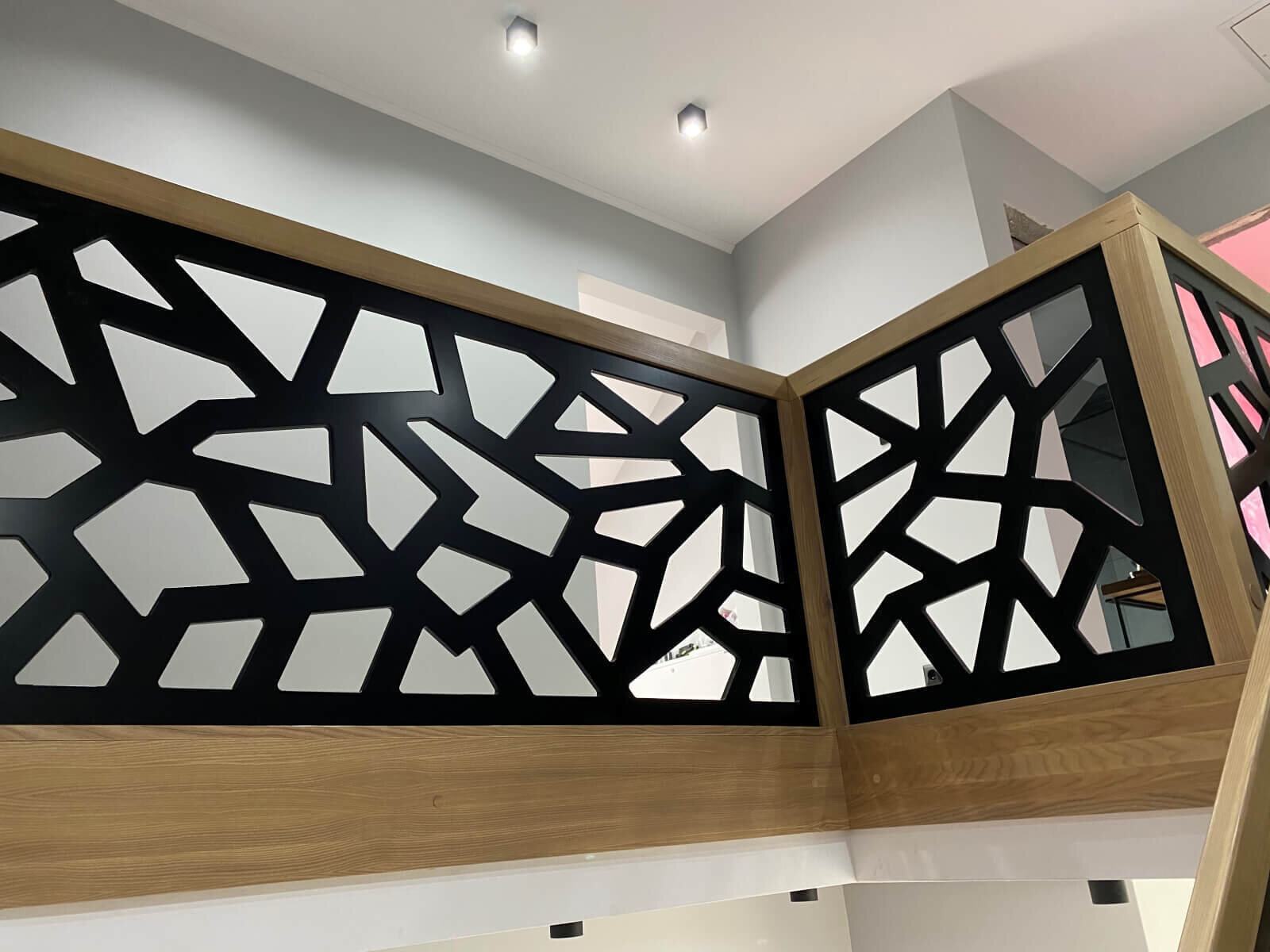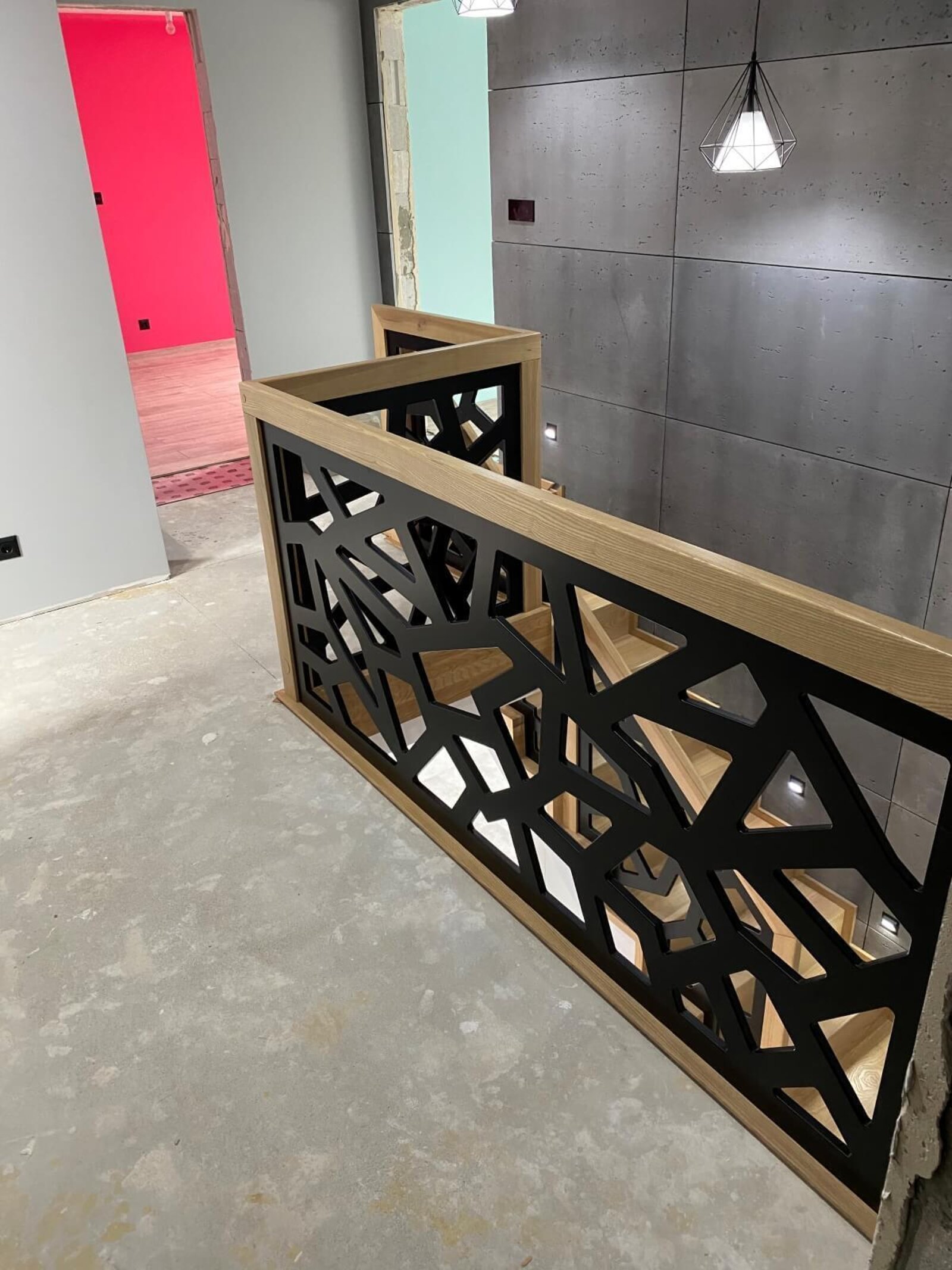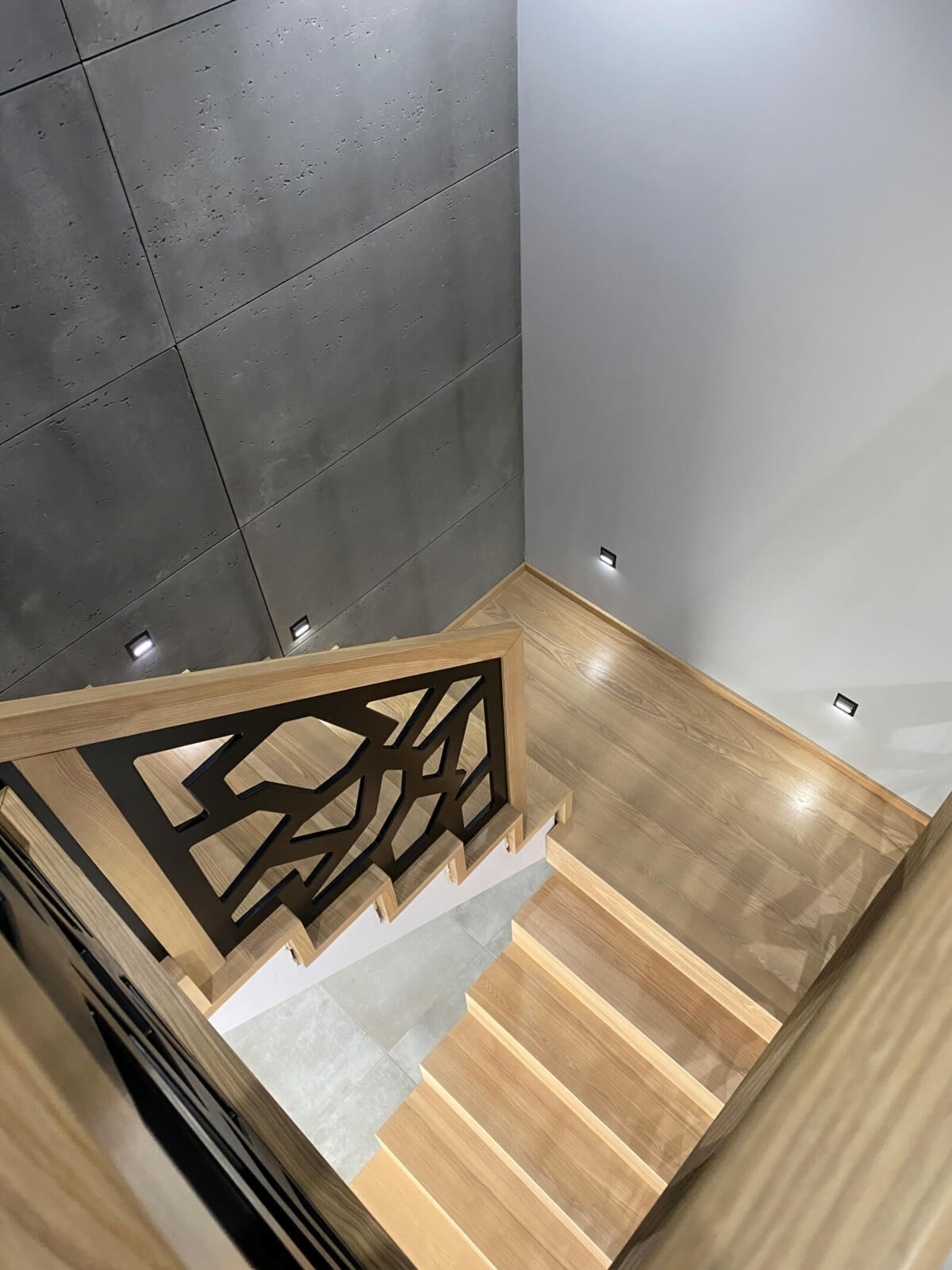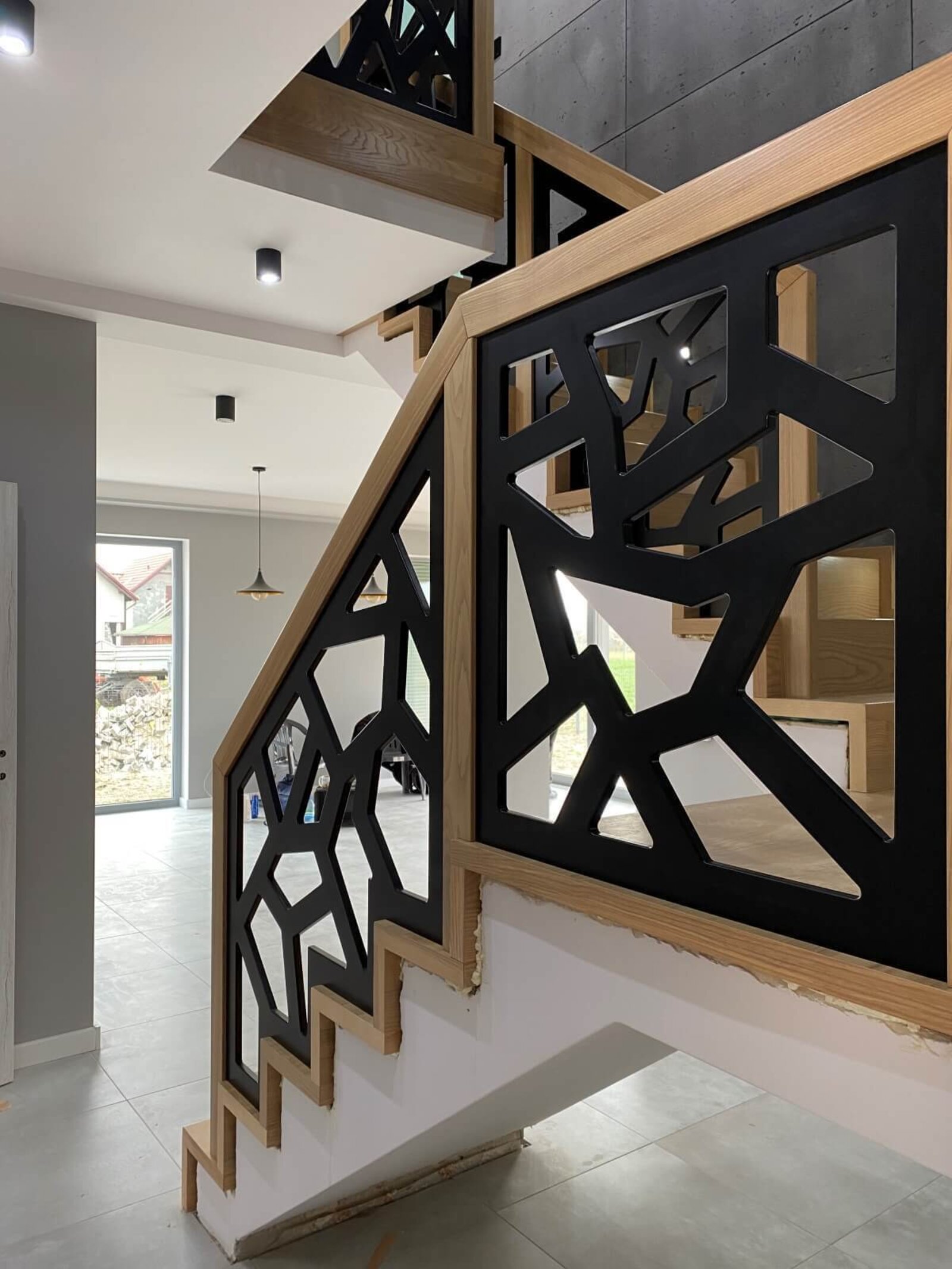 Konstrukcja: Schody dywanowe na beton Balustrada: MDF frezowany, malowany na czarno Drewno: Jesion Kolor: Sonoma